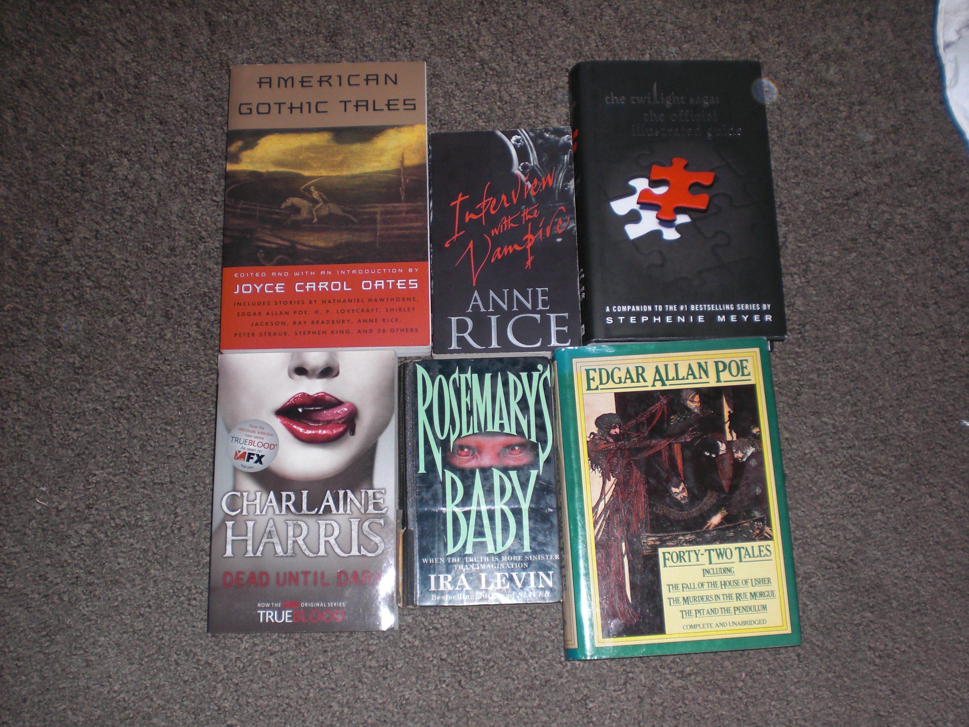Some of my fave Gothic novels/ stories: Joyce Carol Oates – American Gothic Tales (incl. The Legend of Sleepy Hollow etc.), Anne Rice – Interview with the Vampire, Stephanie Meyer – The Twilight Saga, Charlaine Harris – Dead Until Dark (The book to the True Blood series), Ira Levin – Rosemary’s Baby (the movie is brilliant!), Edgar Allan Poe – Forty Two Tales.